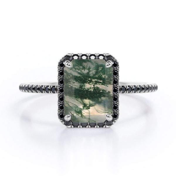 Halo-style Emerald Cut Moss Green Agate With Lab Created Engagement Ring With Pave Accents Images |